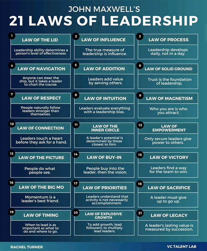 No matter where you are in the leadership process: the greater the number of laws you learn, the better leader you will become. Each law is like a tool, ready to be picked up and used to help you achieve your dreams and add value to other people. Discover the 21 laws every great leader lives by.