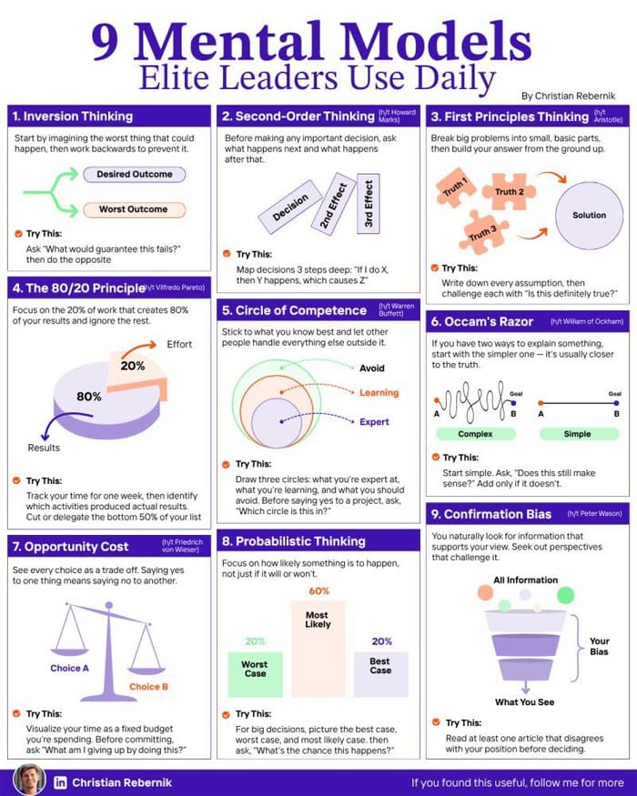 Mental models function as cognitive infrastructure, each framework strengthening decision-making capacity. Leaders who systematically apply these thinking tools develop compound advantages over time, as improved decisions generate superior outcomes that create expanded opportunities.
